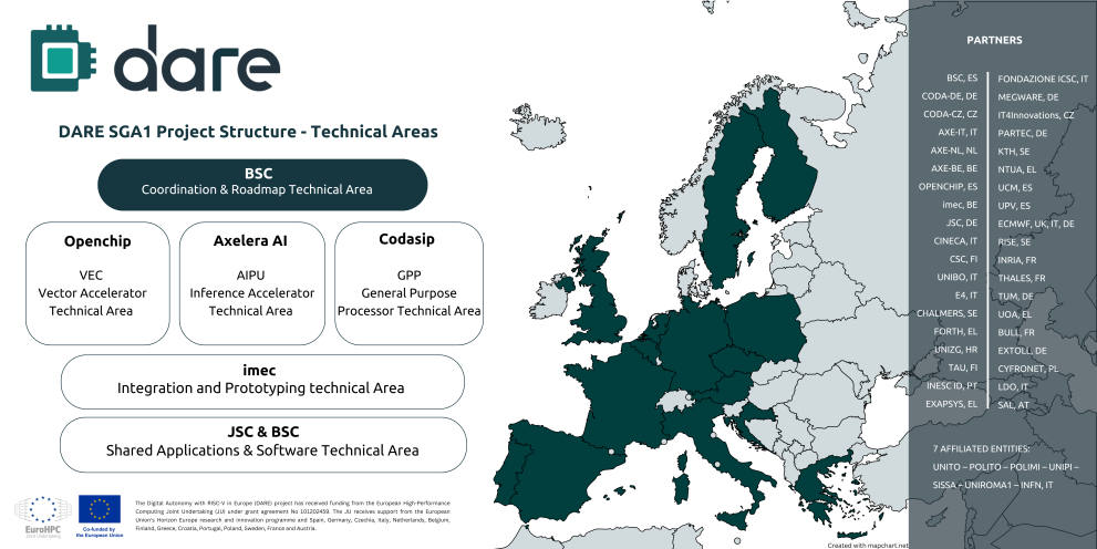 L’Allemand Codasip a été choisi pour concevoir un processeur personnalisable à cœur RISC-V dans le cadre du programme Digital Autonomy with RISC-V in Europe (DARE). Ce programme est financé par l’Union européenne, à hauteur de 240 millions d’euros pour la première phase de trois ans. L’objectif est de mettre en œuvre un processeur RISC-V adapté à l’informatique hautes performances (HPC) par l’intermédiaire d’une équipe européenne. Dans ce projet, l’Espagnol Openchip fournira un accélérateur vectoriel et le Néerlandais Axelera AI un accélérateur d’inférence. Le centre barcelonais BSC (Barcelona Supercomputing Center) assure la coordination technique, l’imec belge l’intégration et le prototypage, et le BSC, en coordination avec son homologue allemand JSC (Jülich Supercomputing Centre), la partie logicielle et applicative.