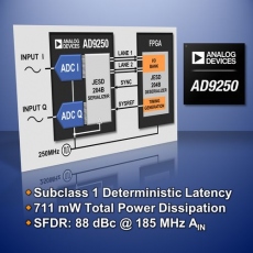Premier CAN de la société à supporter la dernière version du standard JESD204, l’AD9250 est un modèle à deux canaux de résolution 14 bits, dont la cadence d’échantillonnage maximale est de 250 Méch./s. Avec l’AD9250, Analog Devices introduit son premier CAN disposant d’une interface série conforme JESD204B, dernière mouture de la norme Jedec JESD204.