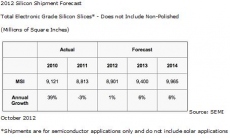 Cette année, les livraisons de wafers de silicium destinés à la fabrication de semi-conducteurs devraient progresser de 1 % par rapport à 2011, à 8901 millions de pouces carrés (soit 5,742 millions de mètres carrés), selon l’association Semi.