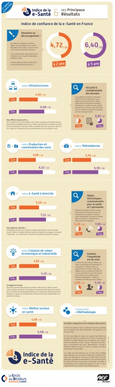 Le Cercle des Décideurs Numérique et Santé vient de publier le premier indice de la e-santé en France. L’indice général de confiance ressort à 4,72/10 à 2 ans et 6,40/10 à 5 ans. Pas très encourageant !