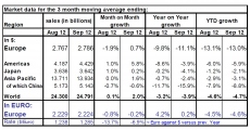 En dépit de cette progression mensuelle, le marché européen, exprimé en dollars, reste nettement en retrait sur 12 mois avec une baisse de 11,1 %. Sur les neuf premiers mois de l’année, la chute des ventes atteint 13 %, soit un déclin deux fois plus important que dans la zone Amérique et quatre fois plus important qu’en Asie. La Chine a vu cependant ses ventes chuter de 8,8 % entre janvier et septembre 2012.