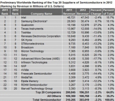 Le classement de IHS iSuppli met également en exergue les difficultés des fabricants japonais Toshiba et Renesas, de l’américain Texas Instruments et de STMicroelectronics, seul européen du top 10, dont on aura suivi, pour les uns, les restructurations, pour les autres, les ajustements de stratégie tout au long de l’année. La seconde meilleure performance de cette industrie est à mettre au crédit de Sony, seul japonais qui s’en sort bien dans le top 20, enregistrant une progression de 20,1% en 2012 selon IHS iSuppli.