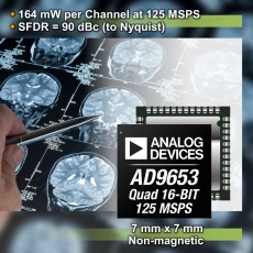 AD9653 d’Analog Devices Offrant quatre canaux 16 bits, ce convertisseur est caractérisé par d’excellentes performances dynamiques et une faible consommation.