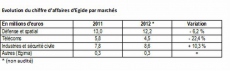 L’industriel a compté pour 34% (28% en 2011) et a progressé de 10,3% à 8,6 M€. Quant au marché des télécoms, il a représenté 18% du total (22% en 2011) et a chuté de 22,4% à 4,5 M€.