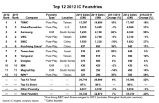 La forte progression de Samsung tient essentiellement à la production de processeurs pour Apple, qui toutefois pourrait faire affaire avec TSMC en 2013 pour une partie de sa producton. L’industrie de la fonderie continue de se concentrer : TSMC en détient presque la moitié à lui tout seul, et le top 12 en représente 90 %.