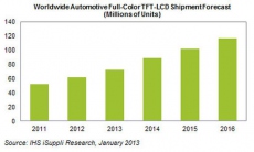 Selon un récent rapport d’IHS iSuppli, les livraisons d’écrans LCD-TFT dédiés aux véhicules légers va presque doubler entre 2012 et 2016, pour frôler la barre des 120 millions d’unités. Le marché des écrans LCD-TFT dédiés aux applications automobiles devrait connaître une période de croissance soutenue entre 2012 et 2016, selon un récent rapport du cabinet d’études américain IHS iSuppli. Sur cette période, la société d’analyse prévoit en effet des croissances annuelles en volume à deux chiffres, comprises entre +15% et +23%.