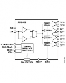 Le décalage temporel entre les différentes sorties est inférieur à 48 ps. Les quatre diviseurs de 10 bits internes permettent de programmer, par un bus série SPI/I²C, un rapport de division jusqu’à 1024. La programmation peut également s’effectuer par l’intermédiaire de broches dédiées.