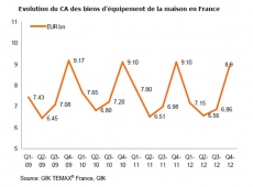 Selon l’institut d’études GfK Temax, les dépenses des français en biens d’équipement de la maison ont atteint 8,9 milliards d’euros au quatrième trimestre 2012, soit une baisse de 1,9% par rapport à la même période en 2011. Sur le cumul des 12 mois, le résultat reste orienté à la baisse (-3,1%). Néanmoins, l’institut d’études relève de fortes disparités selon les secteurs : les télécommunica-tions, la bureautique et les consommables profitent de tendances positives.