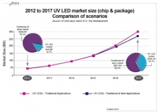Selon une étude de Yole Développement, ce marché devrait atteindre 270, voire 300 millions de dollars d’ici 2017, contre 45 M$ en 2012. Le rythme de croisssance est ici 4 fois plus rapide que celui des lampes UV traditionnelles. Une étude récemment publiée par le cabinet d’études français Yole Développement indique que le marché des LED UV devrait connaître une forte croissance dans les 5 années à venir. Il devrait ainsi passer de 45 millions de dollars en 2012 à 270 M$ en 2017, soit une croissance moyenne annuelle de 43%.
