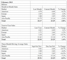 L’analyse par zones géographiques par rapport à février 2012 montre une augmentation des ventes de 6,7% dans la région Asie-Pacifique et de 1,6% dans la zone Amériques, mais une baisse de 1,4% en Europe et de 15,7% au Japon. Par rapport au mois de janvier, elles ont progressé de 1,4% en Europe, mais ont baissé de 3,6% en Asie-Pacifique, de 5% au Japon et de 6,2% dans la zone Amériques.