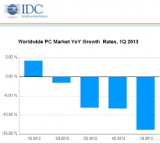 Les ventes mondiales de PC ont chuté de 13,9% au premier trimestre 2013 en rythme annuel, la plus forte baisse depuis 20 ans au cours d’un seul trimestre, selon le cabinet d’études IDC. Ce dernier attribue essentiellement cette chute à l’essor croissant des tablettes et à l’accueil glacial des consommateurs vis-à-vis du nouveau système d’exploitation Windows 8 de Microsoft, et cela même si les fonctionnalités des tablettes sont loin d’être les mêmes que celles des PC. C’est le quatrième trimestre consécutif de baisse sur le marché mondial des PC, note par ailleurs IDC.
