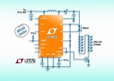 Le LT3955 intègre un commutateur Mosfet canal N de 80 V/3,5 A. A partir d’une tension nominale de 12 V, il est susceptible de piloter 12 LED blanches, avec un courant d’intensité 300 mA.
