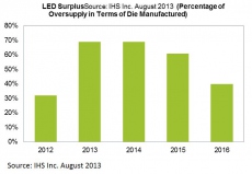 Quoiqu’il en soit, la situation de surproduction reste très forte et cela va continuer dans les années à venir selon IHS, même si le cabinet s’attend à une baisse progressive de cette surproduction (cliquer sur le graphique pour l’agrandir). Sur l’ensemble de l’année 2013, IHS estime que l’offre en puces LED devrait globalement dépasser la demande de 69%, puis de 69% en 2014, de 61% en 2015 et de 40% en 2016.