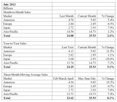 En juillet, les ventes ont augmenté par rapport au mois précédent de 7,9% au Japon, de 5,4% sur le continent américain, de 1,2% en Asie-Pacifique et de 0,3% en Europe. Par rapport au même mois en 2012, les ventes ont fortement augmenté dans la zone Amériques (+21,5%), ont été bien orientées en Asie-Pacifique (7,2%), et ont également progressé en Europe (+1,1%), mais ont fortement chuté au Japon (-18,6%), en grande partie en raison de la dévaluation du yen.