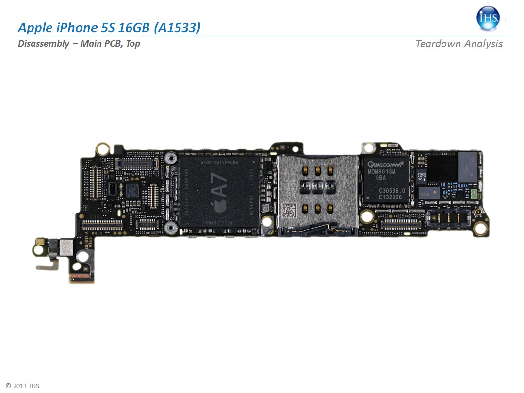 D’après une étude publiée par la société d’analyse IHS, le tout dernier iPhone 5s coûterait 199 $ à fabriquer (coût des composants et de l’assemblage) dans sa déclinaison 16 Go, soit seulement 2 $ de plus que l’iPhone 5 original, pour une marge brute de 69 % et qui grimpe jusqu’à 74 % pour le modèle 64 Go. Principales innovations : le coeur A7 64 bits bien sûr, fabriqué par Samsung, mais aussi et surtout l’utilisation de mémoire Dram DDR3 (Elpida/Micron), le capteur d’empreintes digitales et le frontal radiofréquences compatible LTE (Qualcomm).