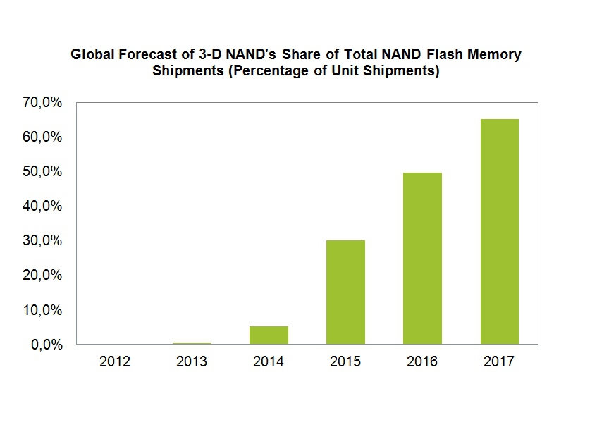 D’après une étude de la société d’analyse IHS, les ventes de mémoires flash Nand produites en technologie 3D, encore confidentielles aujourd’hui, devraient atteindre 5,2 % en 2014, 30,2 % en 2015 et 49,8 % en 2016 du marché total des flash Nand. “Il ne reste qu’une ou deux générations aux mémoires flash Nand réalisées en technologie planaire traditionnelle” estime Dee Robinson, analyste chargé des mémoires et du stockage de données chez IHS. Le mouvement est emmené par les deux leaders du secteur, Samsung et SK Hynix, les autres fabricants (Micron, SanDisk, Toshiba) ayant repoussé le développement de puces mémoires 3D à la prochaine génération.