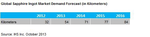 Cette dernière annonce un marché mondial de substrat saphir équivalent à 84 km de lingot de diamètre 2 pouces (5 cm) en 2016 contre 32 km en 2012 et 54 km en 2013.