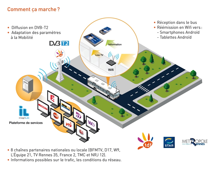TDF a conçu le système et prend en charge le pilotage du projet. Rennes Métropole et Keolis Rennes permettent à TDF d’installer dans les véhicules des lignes 4 et 5 (30 bus), des équipements de réception DVB-réémission Wi-Fi, et contribuent à l’information et la publicité sur le pilote.