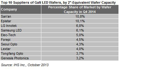 Outre San’an, d’autres fabricants chinois de wafers de GaN pour LED prévoient d’augmenter leurs capacités de production : HC Semitek, Elec Tech et Focus Lihgtings, selon IHS.