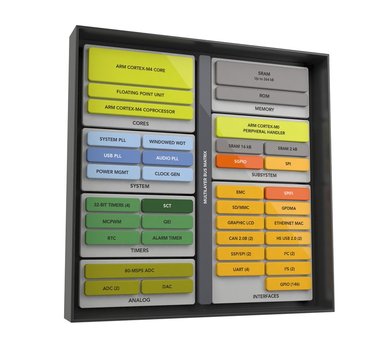 NXP Semiconductors lance le LPC4370, un microcontrôleur à coeur 32 bits Cortex-M4 cadencé à 204 MHz, un record dans l’industrie selon le néerlandais. Le LPC4370 embarque également un coprocesseur Cortex-M0 délestant le M4 de certaines tâches de contrôle, un convertisseur analogique-numérique 12 bits 80 Méch/s, un contrôleur graphique et des ports USB et Ethernet. Il vise les applications d’acquisition de données. Le LPC4370 est vendu 3,96 $ pièce par quantités de 10000.