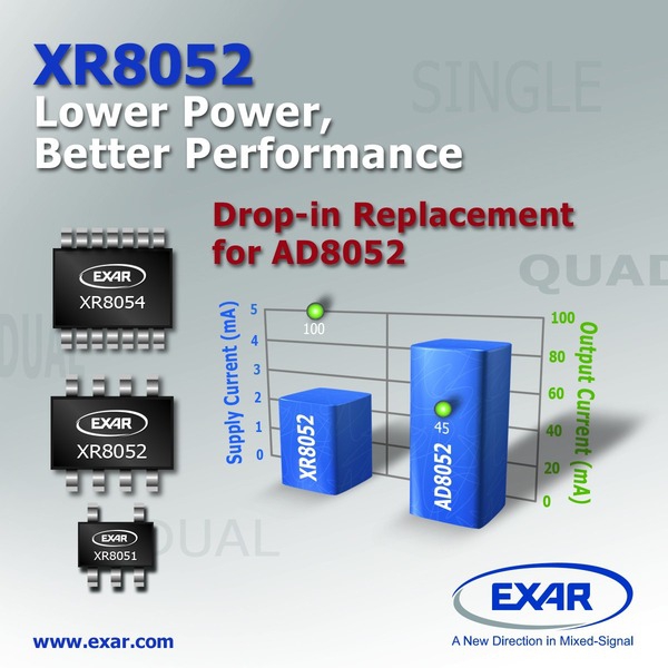 Exar annonce la série XR805x d’amplificateurs opérationnels rapides, notamment conçus pour les systèmes de surveillance et la distribution des signaux vidéo. Les XR8051 (simple), XR8052 (double) et XR8054 (quadruple) constituent des solutions de remplacement aux AD8051/2/4 proposés par Analog Devices, avec lesquels ils sont naturellement compatibles broche à broche.