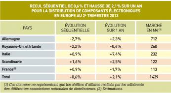 Au 2e trimestre 2013, le marché européen de la distribution de composants électroniques a progressé de 2,1% par rapport au 2e trimestre 2012 et a reculé de 0,6% par rapport au 1er trimestre 2013 à 1439 millions d’euros, selon Idea.