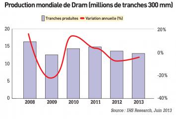 La production de mémoires Dram, désormais concentrée entre trois fabricants seulement (Samsung, Hynix et Micron), devrait diminuer de 5% en 2013, d’où une tendance à la hausse des prix de ces composants.