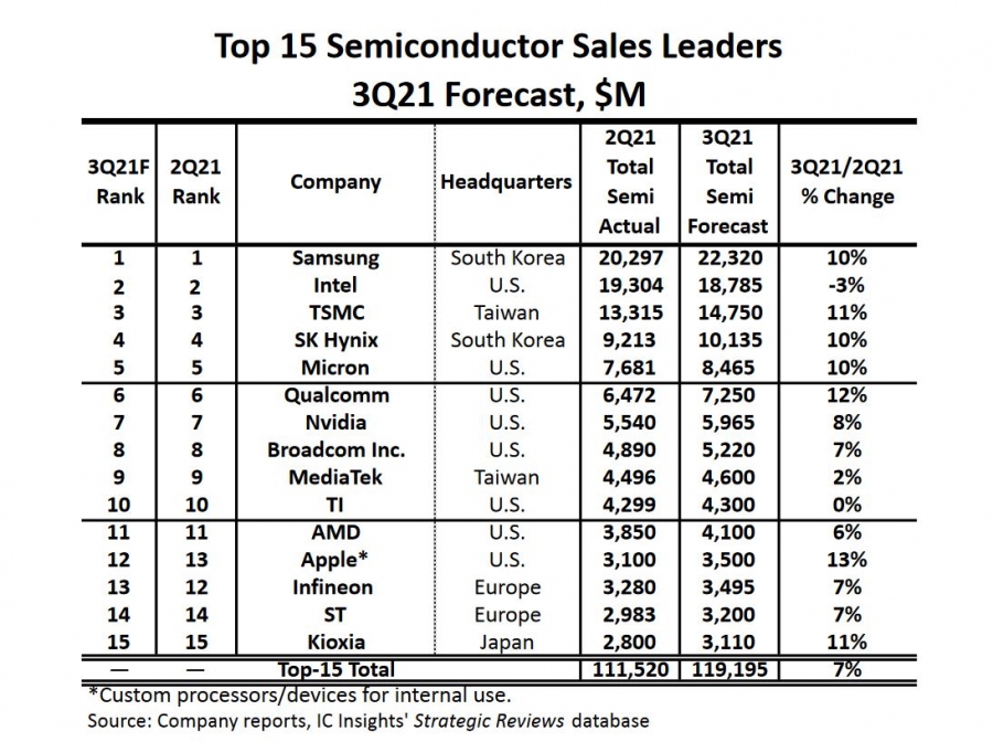Le cabinet d’études IC Insights a publié les prévisions des ventes mondiales pour le 3e trimestre 2021 des quinze premiers fabricants de puces. Collectivement, ces entreprises devraient connaître une croissance de 7% durant ce trimestre pour un montant avoisinant les 120Md$.