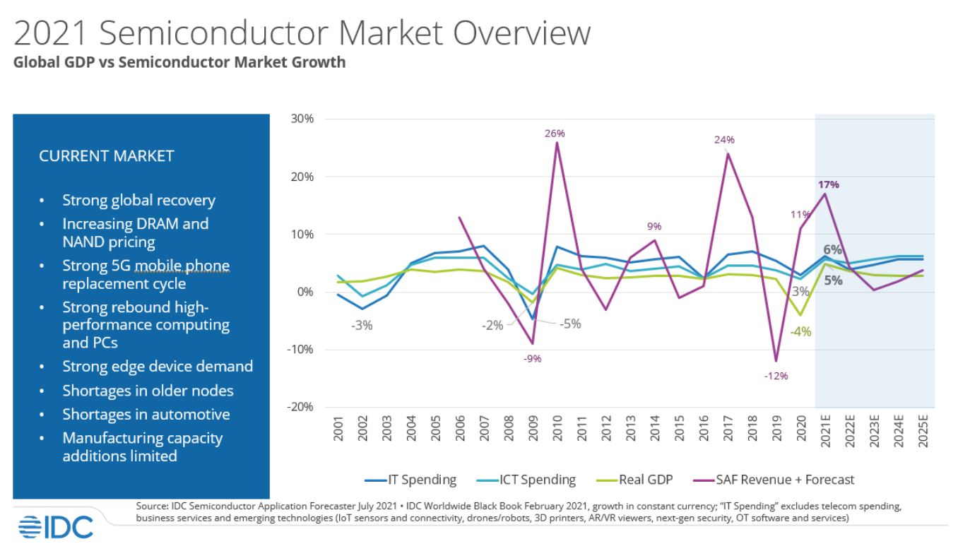 Le cabinet d’études IDC prévoit que le marché des semi-conducteurs connaîtra une croissance de 17,3% en 2021, contre 10,8% en 2020. Le secteur devrait revenir à l’équilibre d’ici le milieu de l’année 2022. Une potentielle surcapacité est attendue en 2023.