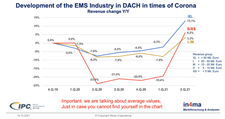 La pandémie a été rude pour les petits sous-traitants européens de l’électronique. les données de la base in4ma de Weiss Engineering révèlent que les effets du Covid se sont ressentis à partir du 2e trimestre 2020, avec des hausses marginales les trois trimestres suivants. Il faut attendre le 2e trimestre 2021 pour voir apparaître une reprise des affaires tangible. D’après le cabinet, seuls les EMS aux chiffres d’affaires annuels supérieurs à 50M€ pourront améliorer leurs résultats par rapport à 2019. Les EMS de taille moyenne (entre 10M€ et 50M€ de chiffre d’affaires) ont une chance moindre mais réaliste d’y parvenir, tandis que les petits EMS devront attendre 2022 pour revenir aux chiffres de 2019. Ce sont ces derniers qui ont le plus souffert à partir du 2e trimestre 2020, avec une baisse moyenne de leur production de 23,9%, alors que les EMS moyens et gros ont vu leur recul se limiter à respectivement 8,2% et 7,6%. Pour certains, disposant de capitaux faibles et travaillant parfois avec trois ou quatre clients seulement, l’activité est chancelante : durant le 1er trimestre 2021, leur production affichait encore un fort recul (-19,4%), contre -7,9% et +2,3% pour les moyens et les gros EMS ; et lorsque vient la reprise le trimestre suivant, celle des petits sous-traitants reste toujours inférieure à celle des ténors, avec +3,3% contre +6,2% et +13,1%.