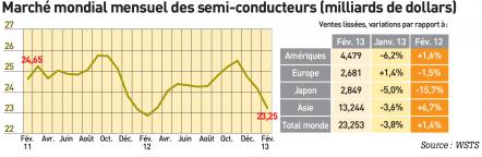 le marché mondial des semi-conducteurs a progressé de 1,4% en février 2013 par rapport à la même période de l’an passé. cependant, il a baissé de 3,8% par rapport à janvier, ce qui reflète une tendance saisonnière habituelle. sur les deux premiers mois de l’année, les ventes ont progressé de 2% par rapport à la