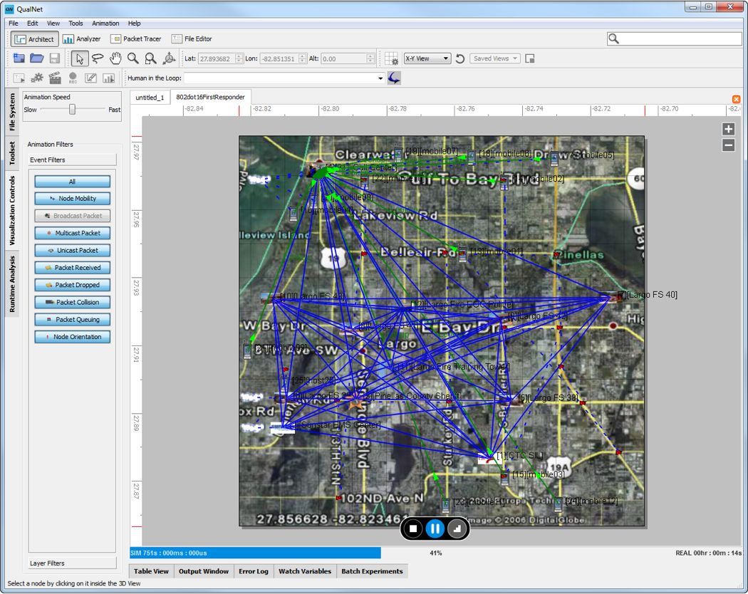 Son offre s’articule autour d’un écosystème de jumeau numérique d’un réseau et des logiciels de simulation QualNet (voir photographie) et d’émulation EXata, destinés à la conception de réseaux de communication hétérogènes et à grande échelle, leur test et leur analyse, ainsi qu’à leur cyber-évaluation et à la formation.
