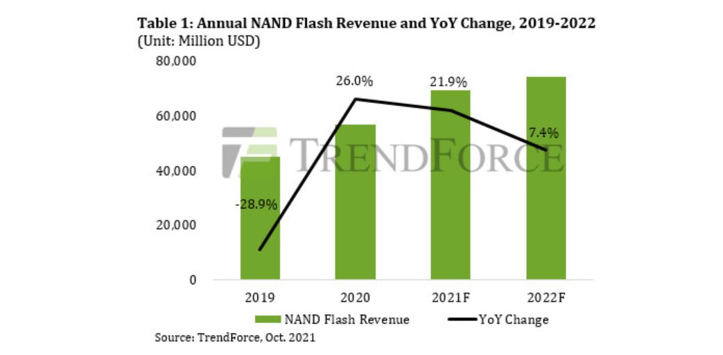 L’offre annuelle de flash Nand augmentera de 31,8% en 2022, tandis que la croissance de le demande devrait plafonner à 30,8%.