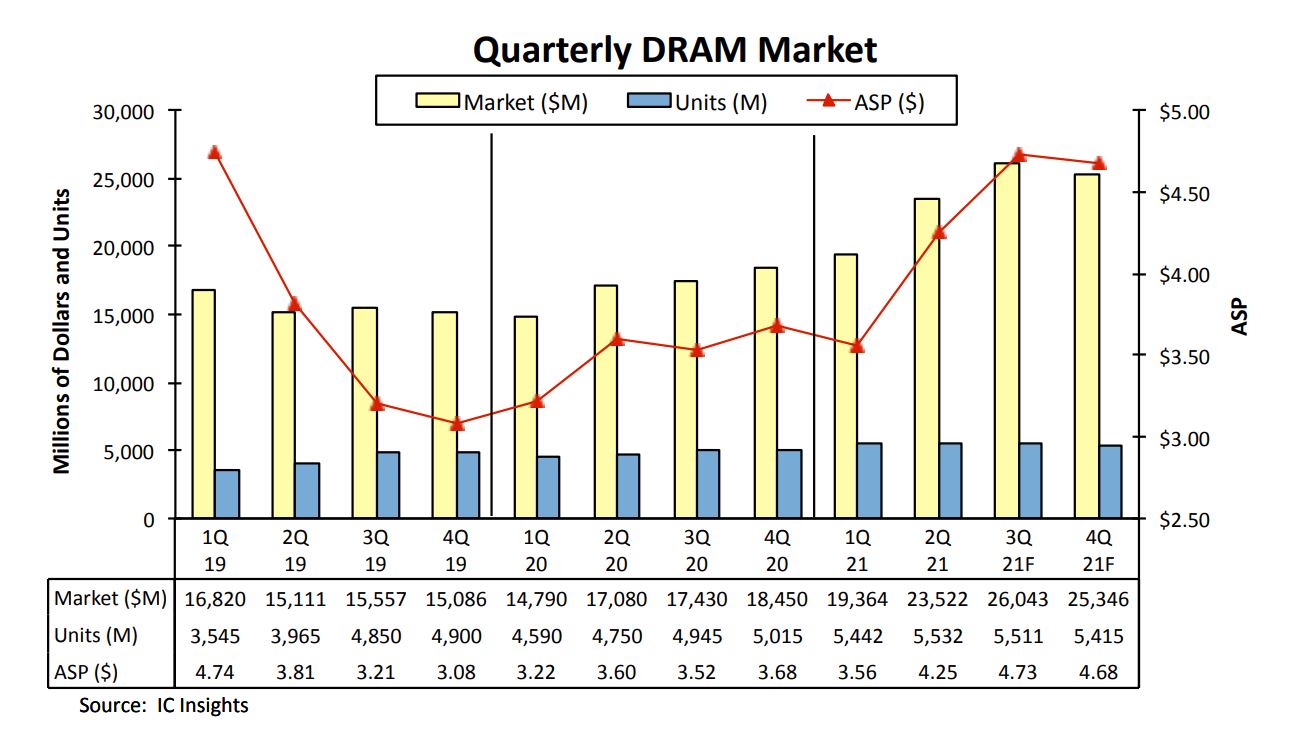 Pour la Dram graphique, IC Insights explique qu’« au cours du dernier trimestre de cette année, de graves pénuries de circuits intégrés de commande, de gestion de l’alimentation et d’autres circuits périphériques devraient limiter la production de cartes graphiques, ce qui a diminué l’activité d’approvisionnement en Dram graphique. En conséquence, le prix de la Dram graphique devrait également être en baisse de 0 à 5% au 4e trimestre 2021 ».