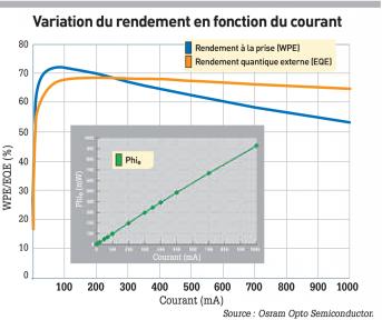 Osram Opto Semiconductors a développé en laboratoire une puce infrarouge de 1 millimètre carré caractérisé par un rendement à la prise (Wall Plug Efficiency) de 72 % pour un courant de fonctionnement de 100mA.