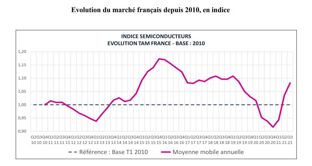 Enfin, Acsiel précise qu’ « en moyenne mobile annuelle, le marché des semi-conducteurs est à un niveau qui n’avait pas été atteint depuis le 4e trimestre 2019 ».