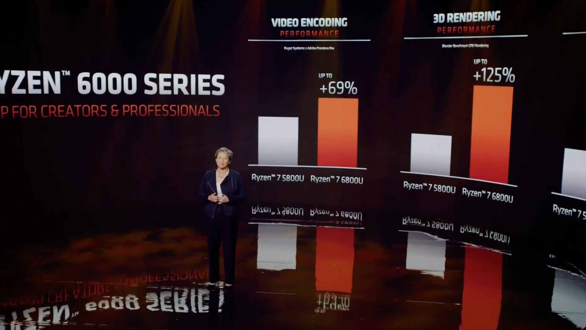 AMD a profité du CES de Las Vegas pour annoncer en grande pompe ses nouveaux processeurs pour PC portables, baptisés Ryzen 6000. Ces circuits tirent parti de la dernière microarchitecture de cœurs Zen 3+, ainsi que de la génération graphique RDNA 2. Fabriqués dans le process 6nm de TSMC, ils offrent des fréquences de traitement supérieures de 30% et des performances graphiques doublées par rapport aux précédents Ryzen 5000. Les Ryzen 6000 supportent par ailleurs la mémoire DDR5 et les interfaces PCIE 4.0 et USB4.