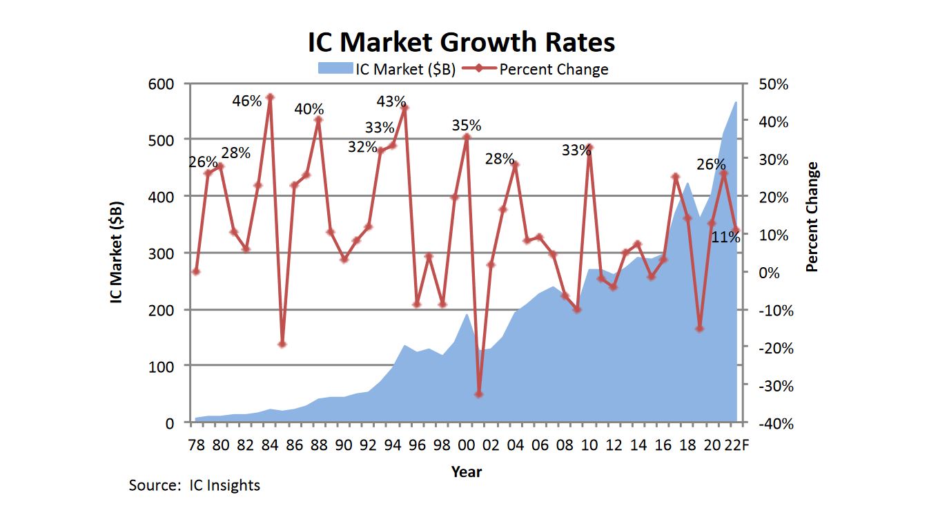 Selon les prévisions du cabinet d’études IC Insights, le marché des circuits intégrés augmentera de 11% cette année pour atteindre 565,1 milliards de dollars, après une forte hausse l’an passé de 26% à 509,8Md$ et de 13% en 2020.