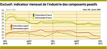 la tendance sur 3 mois en passifs fait ressortir une baisse des commandes de 8 % en france et de 15% à l’export. le book-to-bill en france est proche de 1, mais celui à l’export est inférieur à 1. sur le marché français, les commandes en connecteurs (-7 %) ont moins souffert que celles des