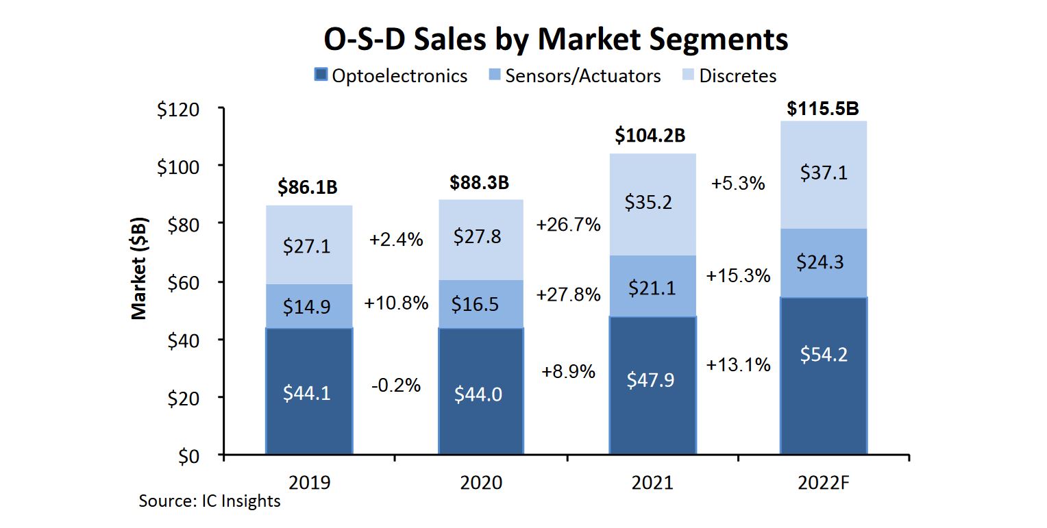 IC Insights prévoit que les ventes de produits OSD atteindront 115,5Md$ en 2022, soit une hausse de 11%.
