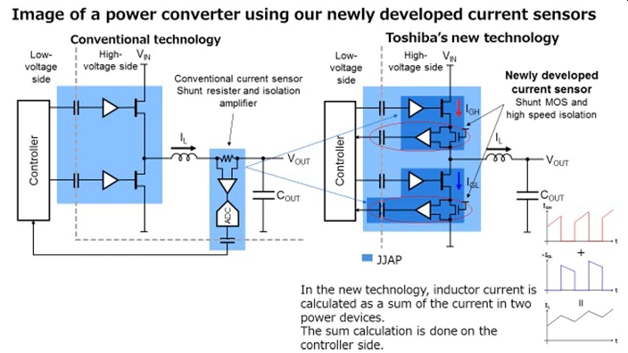 Dans un article publié dans le Japanese Journal of Applied Physics (JJAP), Toshiba a décrit une architecture de convertisseur en demi-pont intégrant un capteur de courant Mosfet – une première dans l’industrie selon le Japonais. Ordinairement, une résistance shunt est utilisée pour mesurer le courant au niveau de l’inductance de sortie et réguler le convertisseur. Cette résistance bénéficie d’une faible variation en température, mais suscite une dissipation d’énergie non négligeable. A contrario, Toshiba mesure le courant comme la somme des intensités circulant dans deux Mosfet basse tension, avec une résistance équivalente (et donc des pertes) fortement réduite. Toshiba assure avoir réglé le problème de la dépendance des Mosfet en température.