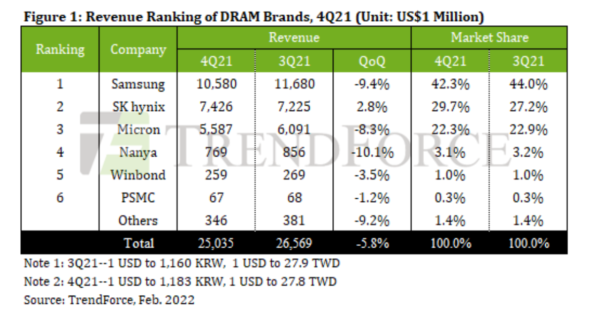 Au 4e trimestre 2021, la production globale de Dram a diminué de 5,8% par rapport au trimestre précédent pour atteindre 25,03Md$, selon le bureau d’études TrendForce.