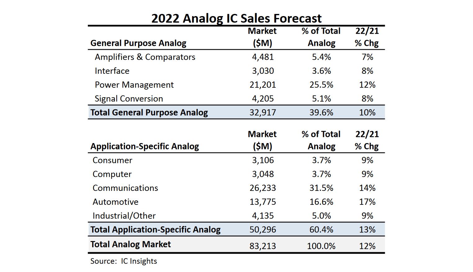 Pour IC Insights, le marché des communications devrait représenter la plus grande partie des ventes de circuits intégrés analogiques en 2022.