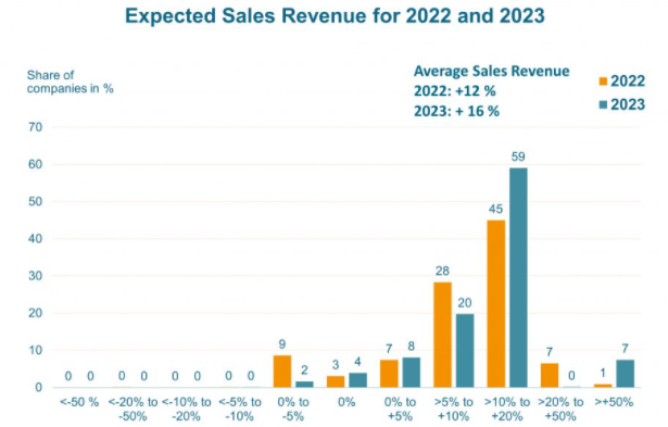 Malgré tout, plus des trois quarts des participants à l’enquête prévoient des investissements dans les six prochains mois. En outre, côté emploi, 69% d’entre eux prévoient d’augmenter leur personnel, contre 23% relevés au terme de l’enquête d’octobre 2021. Cette hausse « significative » est même la plus élevée depuis le début des enquêtes semestrielles initiées il y a huit ans. Cela corrobore sûrement la croissance du chiffre d’affaires estimée à 16% pour 2023.