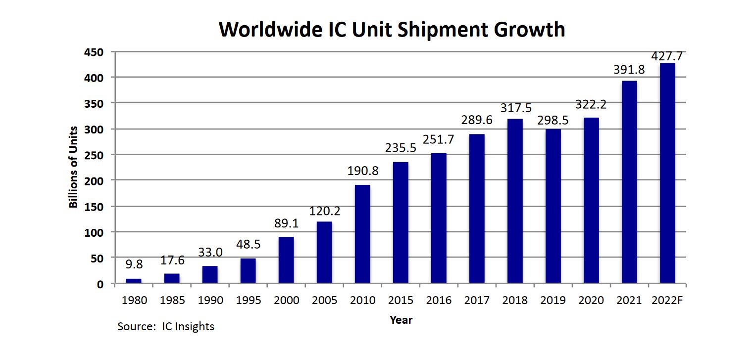 Dans son dernier bulletin, IC Insights prévoit que les expéditions mondiales de circuits intégrés augmenteront de 9,2% cette année pour atteindre un volume de 427,7 milliards d’unités. Ce qui représente près de cinq fois plus d’unités expédiées qu’en 2000.