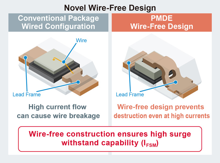 Rohm poursuit l’expansion de son catalogue de diodes encapsulées dans le boîtier miniature PMDE. Ce boîtier de 2,5×1,3mm offre les mêmes caractéristiques électriques que le SOD-323 (3,5×1,6mm) grâce à la refonte de l’électrode arrière qui améliore la dissipation thermique. Cette réduction de l’encombrement de 42% s’accompagne d’une plus grande robustesse mécanique, avec une structure interne désormais sans fil.