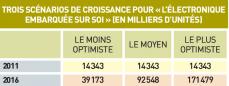 IHS prévoit trois scénarios de croissance pour ce marché qui inclut les appareils électroniques utilisés par la remise en forme (cardiomètres…), par la santé (analyseurs de taux de glucose…), par le militaire et l’industriel, ainsi que par l’infotainment.