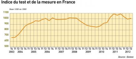 après deux trimestres de baisse, l’indice de conjoncture test & mesure du simtec, syndicat français de la profession qui représente environ 80% du marché français de ce secteur, a légèrement remonté et reste à un niveau élevé, voisin de celui d’avant la crise de 2008-2009.