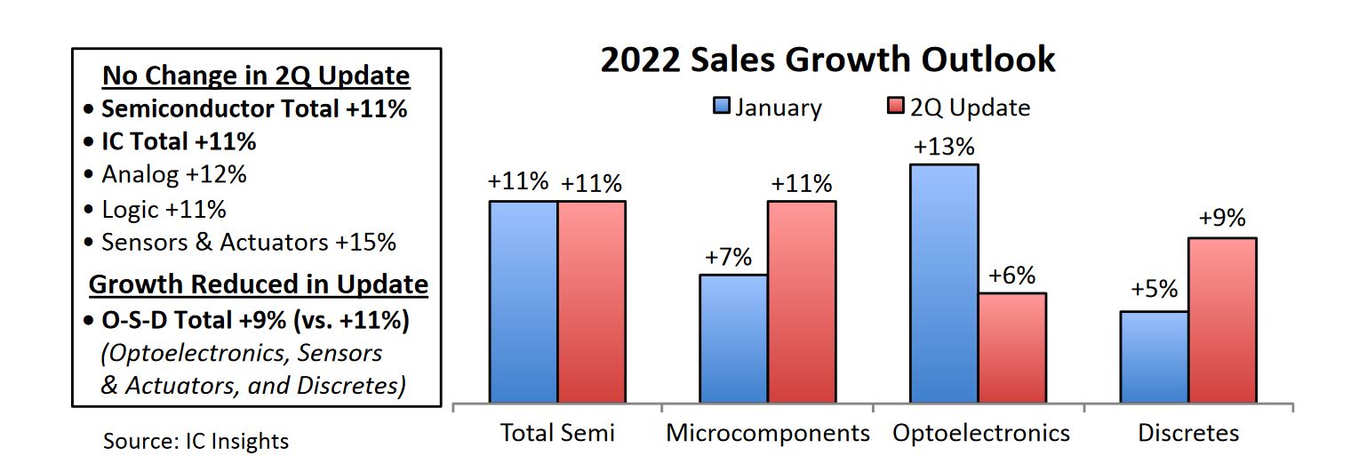 Malgré un contexte économique particulier avec l’inflation, les coûts de l’énergie, les problèmes des chaines d’approvisionnement ou encore la guerre en Ukraine et les restrictions actuelles dues au Covid-19 en Chine, IC Insights estime que la croissance du marché des semi-conducteurs pour l’année 2022 sera de 11% à 680,7Md$.