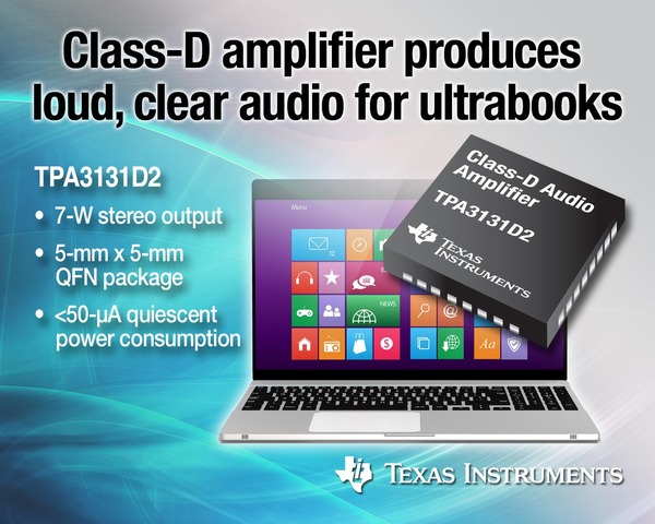 Pour les ultrabooks, les enceintes Bluetooth et les stations d’accueil, Texas Instruments introduit un amplificateur audio stéréo fonctionnant en classe D, capable de délivrer une puissance de 7 W dans un boîtier QFN miniature (5×5 mm) de 32 broches. Une puissance obtenue sur une charge de 4 Ohms, avec un taux de distorsion et bruit de 10 % à 1 kHz et une tension d’alimentation de 7,4 V).